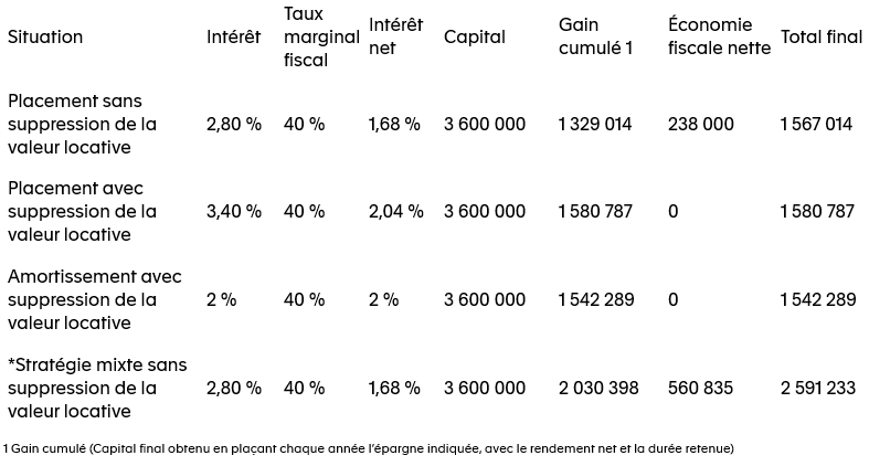 Nous présentons également une stratégie mixte, sans suppression de la valeur locative, qui sera détaillée plus loin.